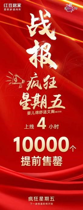 紅豆有禮,約“惠”七夕。7月下旬,在第24屆紅豆七夕節IP的強力加持下,紅豆居家通過精心策劃的“瘋狂星期五”營銷活動,每周精選一款兼顧舒適悅己與高性價比優勢的品質好物,限時秒殺、限量搶購,掀起了現象級消費熱潮。首波主推的嬰兒綿舒適文胸在短短10小時內狂銷1萬件,第二波活動更攀新高,創下4小時售罄1.2萬件文胸的驕人戰績,再次證明了“紅豆”品牌背后的硬核產品力和強大市場吸引力。