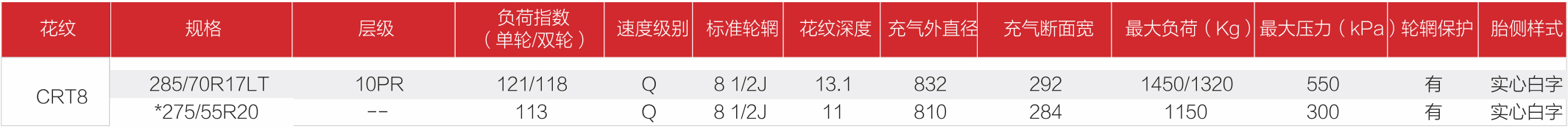 YUNCHANG R/T CRT8 使用高耐磨型橡膠配方,增強花紋塊結構,提升輪胎花紋塊強度,增加承載能力。增強化的輪廓結構,胎面更平,抓地力更強。
